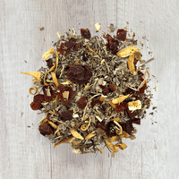Baies d'églantier, sauge, pétales de fleur d'oranger, écorces d'orange, mélisse, arômes (poire et mandarine).