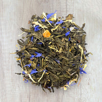 Thé Vert (Chine), arômes naturels de fruits rouges, figues, datte, morceaux de mangue et ananas, pétales soucis et bleuets, raisin.