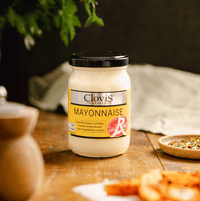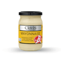 Pot de mayonnaise Label Rouge de la marque Clovis France. Étiquette jaune et argent indiquant une recette traditionnelle avec une liste d’ingrédients limitée.