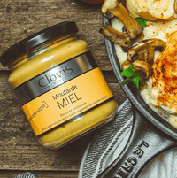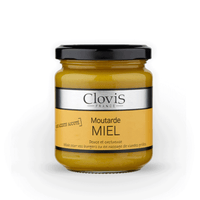 Pot de moutarde au miel de la marque Clovis France. Étiquette jaune et argent indiquant une moutarde douce et onctueuse, idéale pour burgers et viandes grillées.
