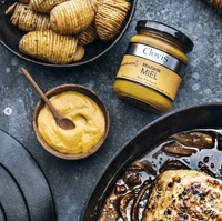 Pot de moutarde au miel Clovis France placé à côté d’un bol de sauce crémeuse et de pommes de terre rôties.