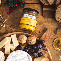 Pot de moutarde au miel Clovis France entouré d’un plateau de fromages, noix et raisins.