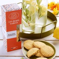 Boîte de sablés Les Bons Sablés au romarin et parmesan de la Maison Toussaint, présentée avec des biscuits sur une assiette verte. Deux verres de citronnade avec des branches de romarin sont placés à côté sur un plateau rond doré, avec des citrons en arrière-plan.