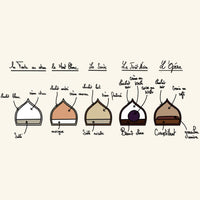 Chocolat blanc 34% cacao (sucre, beurre de cacao, poudre de lait, lécithine de soja, arôme naturel de vanille), chocolat noir 68% cacao (pâte de cacao, sucre, beurre de cacao, lécithine de soja, arôme naturel de vanille), crème entière, beurre, chocolat au lait 36% cacao (sucre, poudre de lait, beurre de cacao, pâte de cacao, lécithine de soja, arôme naturel de vanille), chocolat ambré 32% (sucre, beurre de cacao, poudre de lait, graisse de lait, lactoserum, lécithine de tournesol, arôme naturel de vanille), sucre, crème de marron, pâte de marron, beurre de cacao, glucose, farine de blé, sorbitol, jus et zestes de citron, pâte de noisette, crêpes dentelles (farine de blé, sucre, beurre, huile de tournesol, lait poudre, malt d'orge, sel), blancs d’œufs, sucre glace, œufs, kirsch, eau, noisette poudre, dextrose, cacao poudre, purée de citron concentrée, extrait de vanille, rhum, lécithine de soja, café soluble, extrait de café, sel.