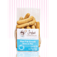 Sachet transparent de petits gressins "Mon P’tit Gressin Terre et Mer" de la marque Sophie Farrugia, avec une étiquette bleue et blanche mentionnant "Sans colorants, sans conservateurs, sans additifs", posé devant un fond à rayures roses.