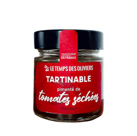 Bocal en verre de tartinable pimenté de tomates séchées biologiques, de la marque Le Temps des Oliviers. L’étiquette rouge vif met en avant le nom du produit en lettres blanches, avec des illustrations discrètes de piments et tomates. Le couvercle est noir et scellé par une bande rouge portant la mention "Transformé en France".